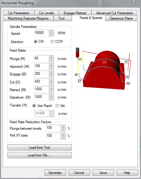 Engage Values indicate how fast the Tool is moving when 50% of the Diameter of the Cutting Tool is engaged in the material. This occurs very quickly, after an Approach Motion.